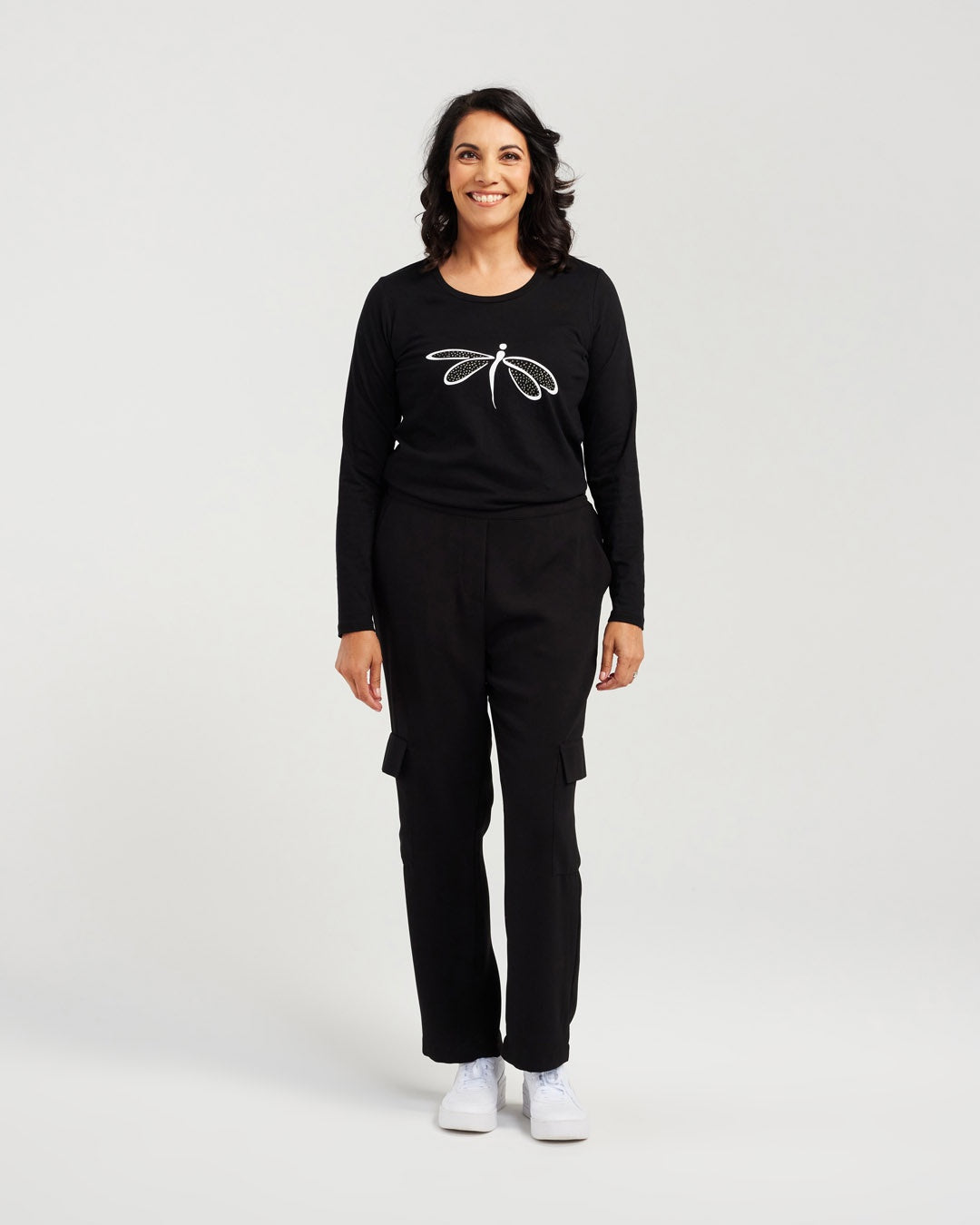 Long Sleeve Black Tee Shirt with White Print Dragonfly