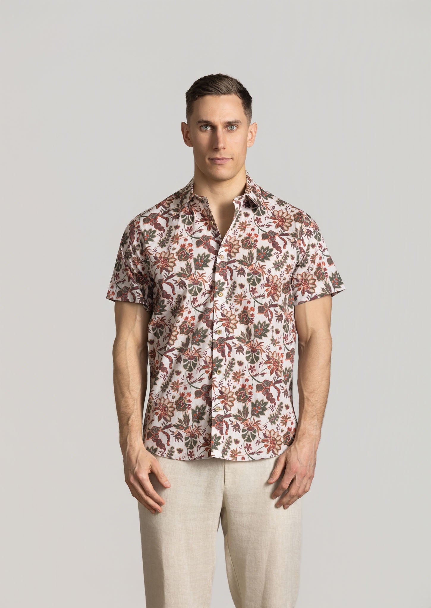 A Red and Green leaf design, short sleeve shirt