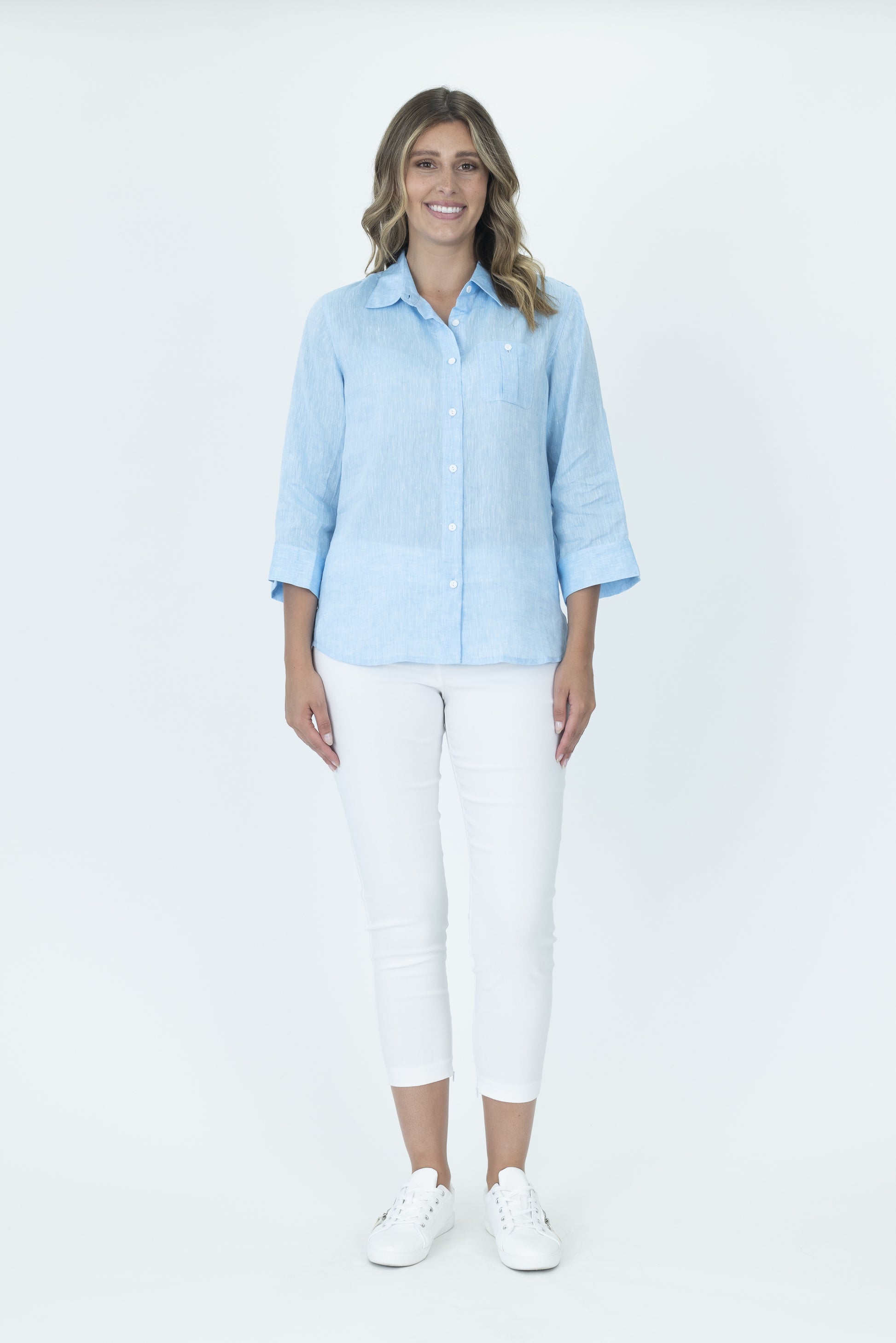 Maglia Ladies Light Blue Linen 3/4 Sleeve Collared Shirt