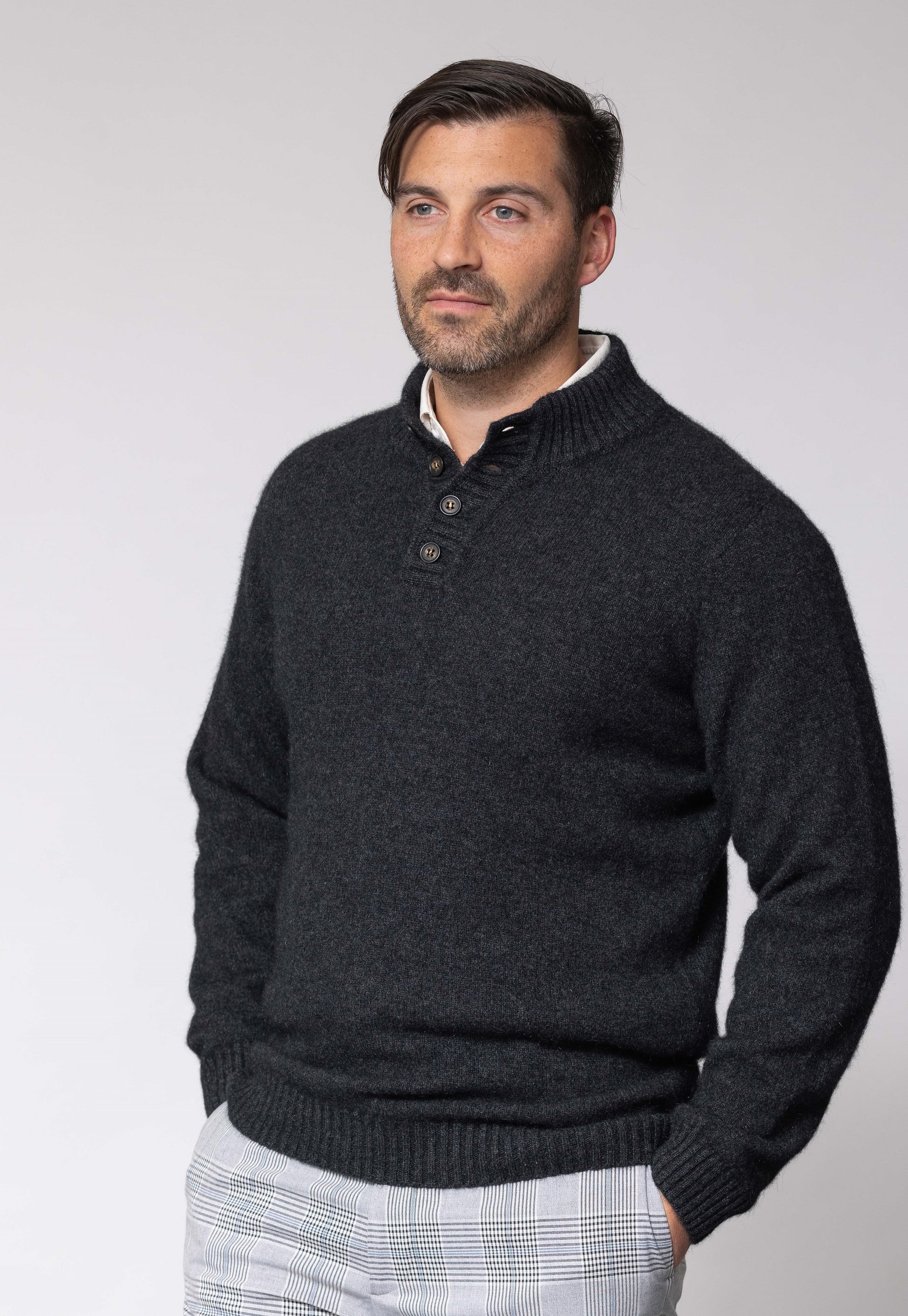 Quarter button up merino possum jumper with crew neck. Has contrast lighter colour inside the neck