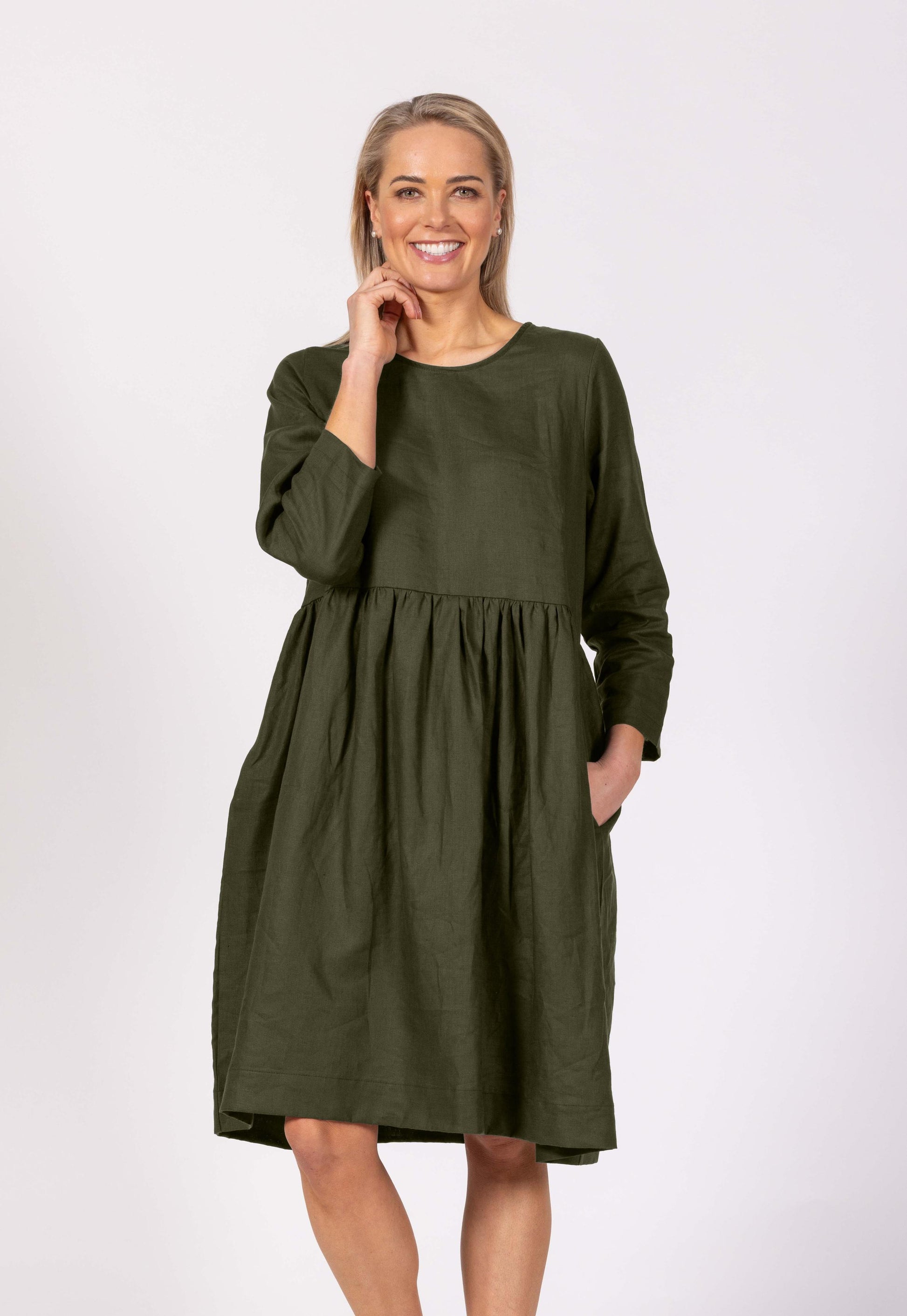 This dress is a midi length, long sleeve, gathered waist, crew neck style
