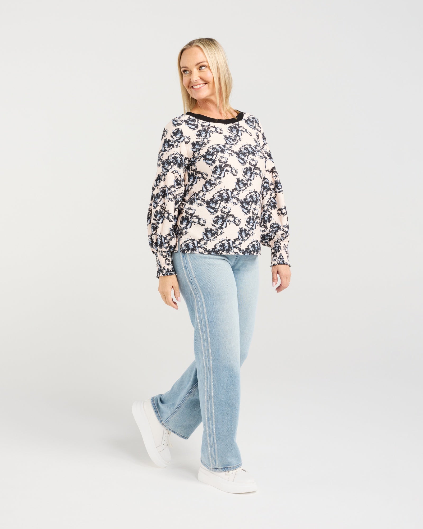 The Amalia top is a round neck with black outline, shirred cuff, long sleeved style top