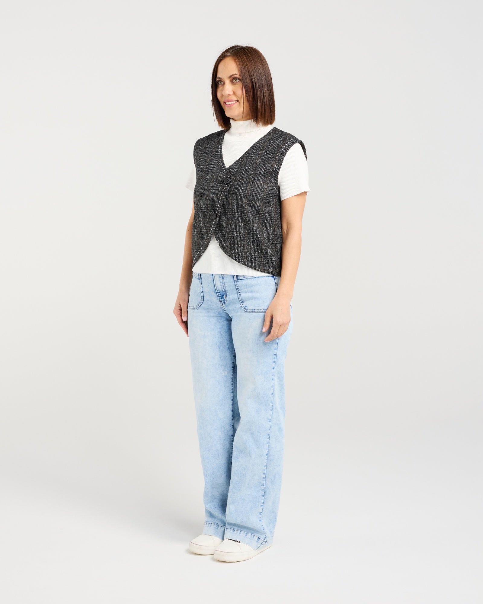 This vest is collarless with 2 buttons. A plaid design with white stitching detail